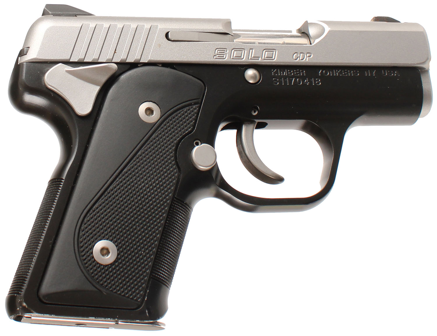 Kimber Custom Shop, Solo CDP, CAL: 9mm, MFG: Modern, S1170418, Semi Auto Pistol, 2 3/4'' barrel. The checkered metal grips are excellent. The original gloss black finish on the frame rates 97% & the stainless steel slide is excellent, with a couple small areas of discoloration. Bore is excellent. Mepro Tru-Dot Tritium powered night sights. Comes with Kimber marked soft case. FFL Req. - Value: 500 to 700