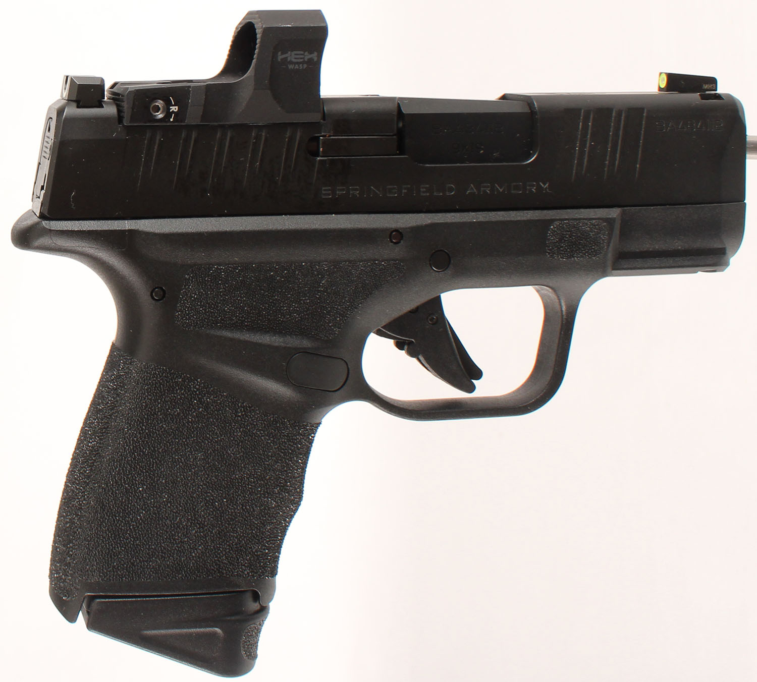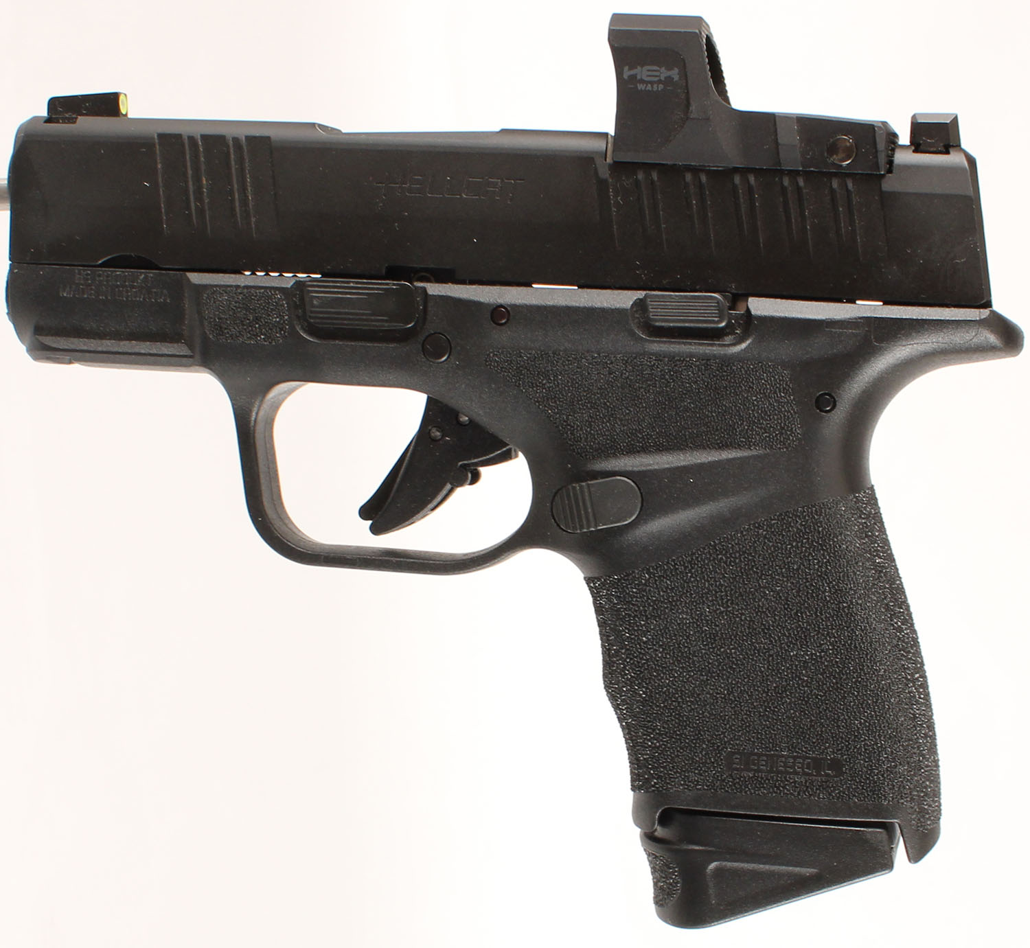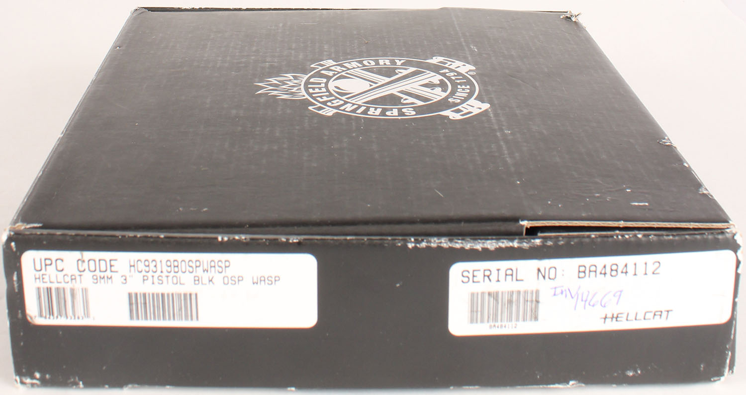 NEW, BOXED, Springfield Armory, Hellcat, CAL: 9mm, MFG: Modern, SN: BA484112, Semi Auto Pistol, 3'' barrel. The textured polymer grip frame is excellent. The matte black finish on the slide rates 99%. Bore is excellent. Factory U-Dot rear sight & photoluminescent front night sight. Optical Sight Pistol, fitted with a HEX Wasp Red Dot sight. Comes in factory box, with soft carrying case, related paperwork, lock, speed loader & extra 11 rnd mag. NIB & NOS. FFL Req. - Value: 600 to 900