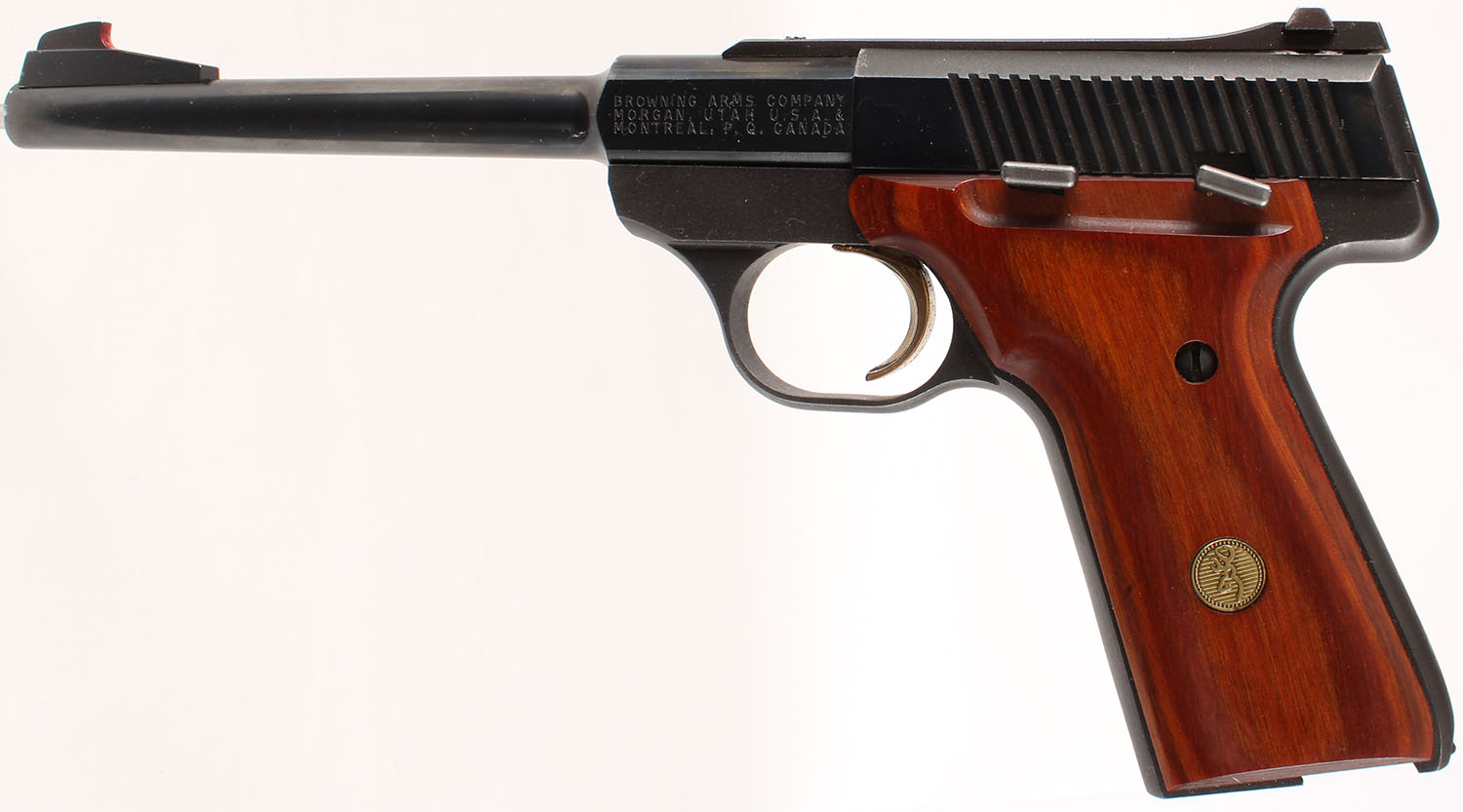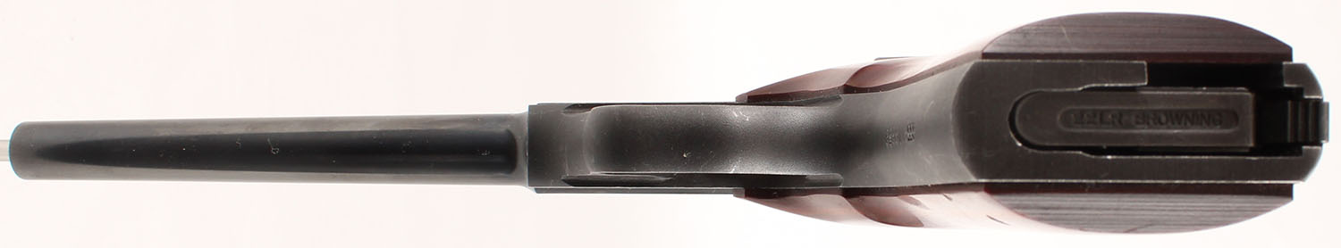 Browning Arms Co., Challenger II, CAL: 22LR, MFG: 1976-82, SN: 655PY16659, Semi Auto Pistol, 6 3/4'' barrel. The Browning logo medallion wood grips are excellent. There are minor handling marks to the finish. The polished & matte blue finish rates 97% overall. Gold tone trigger. Bore is very good, with areas of roughness. Adjustable rear sight & elevated blade front sight. FFL Req. - Value: 300 to 500