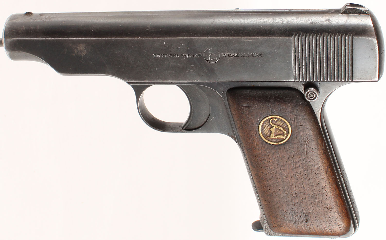 Deutsche Werke, Ortgies Patent, CAL: 7.65 (32 Auto), MFG: 1919-24, SN: 91731, Semi-Auto Pistol, 3 3/8'' barrel. The left side of the slide is marked ''DEUTSCHE-WERKE (LOGO) WERK EFURT'', the right side is marked ''ORTGIE'S PATENT'' & the frame, on the underside of the barrel is marked with the full SN, over ''GERMANY''. The logo brass medallion wood grips are excellent & solid, with scrapes & dings to the finish. The metal blue finish rates 75% overall, with a thin brown patina, areas of pitting & the muzzle has worn to metal gray. Bore is very good, with strong rifling & consistent roughness. The slide holds a fixed small notch rear sight & small blade front sight. FFL or C&R Req. - Value: 100 to 250