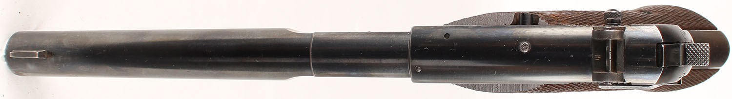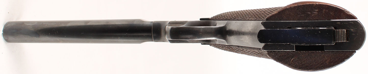 Hi-Standard, Model H-D Military, CAL: 22LR, MFG: 1947, SN: 218168, Semi Auto Pistol, 6 3/4'' barrel. The original checkered wood grips are excellent. There is light wear to the checkering at the handling points. The metal blue finish rates 70% on the barrel & 85% on the frame & slide. Bore is excellent, appears slightly grainy. The slide has an adjustable rear sight & the barrel has a serrated blade front sight. FFL or C&R Req. - Value: 250 to 450