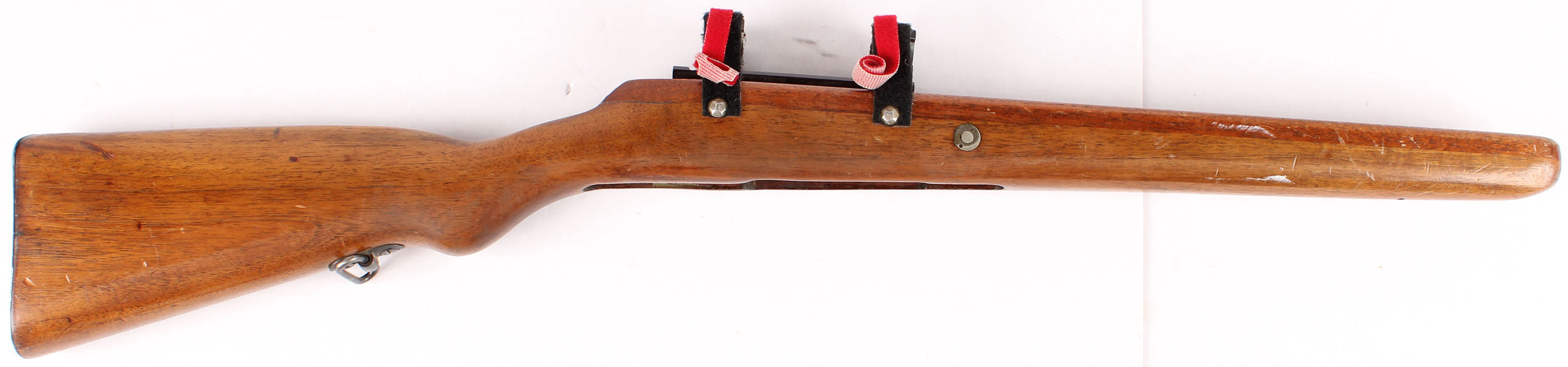Rifle wood stock made for viewing scopes, has velcro straps for easy on & off so the customer can view the scope cross hairs. Grade: Excellent - Value: 2 to 50