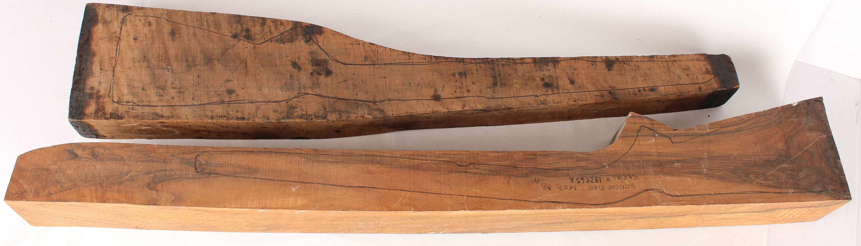 Lot of 2 uncut wood rifle stocks, 34 1/2'' x 41'' long. Grade: Excellent - Value: 20 to 200