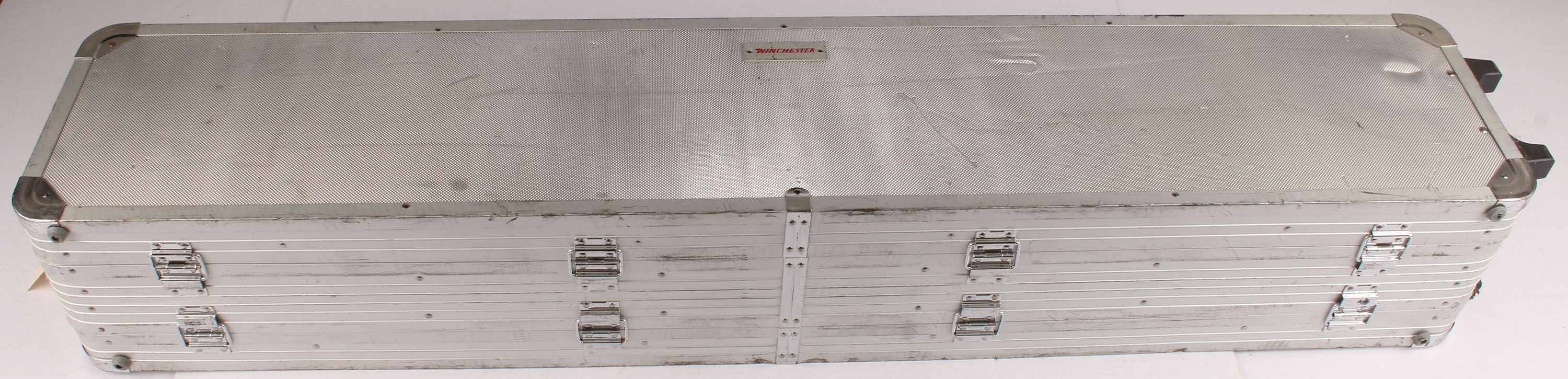 Winchester, aluminum 2 tier gun case, has foam inserts, folding handles, spots for padlocks, & wheels. Case has minor scratches, dings, dents, & scuffs from use. Case is 53'' x 10'' x 8 1/4''. Grade: Very Good ++ - Value: 50 to 150