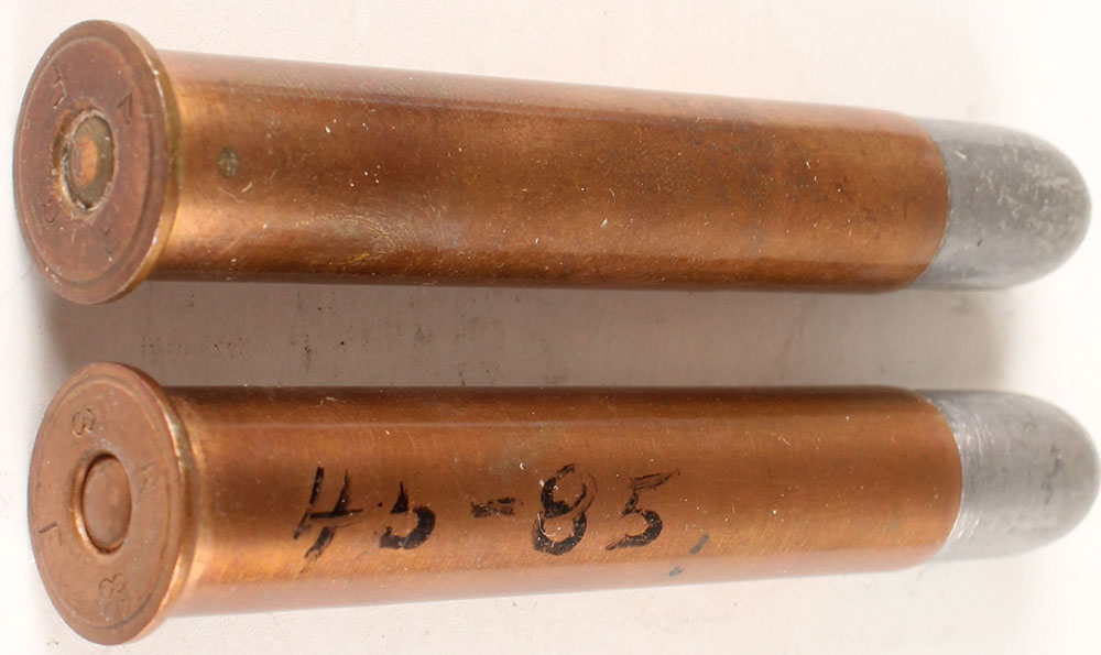 Lot of 2. 45-80 'Sharpshooter', 2.4'' case. HS:''R 83 F 3'' & ''R 81 F 4''. Both w/ 500 grain bullets. Grade: Excellent + - Value: 10 to 30