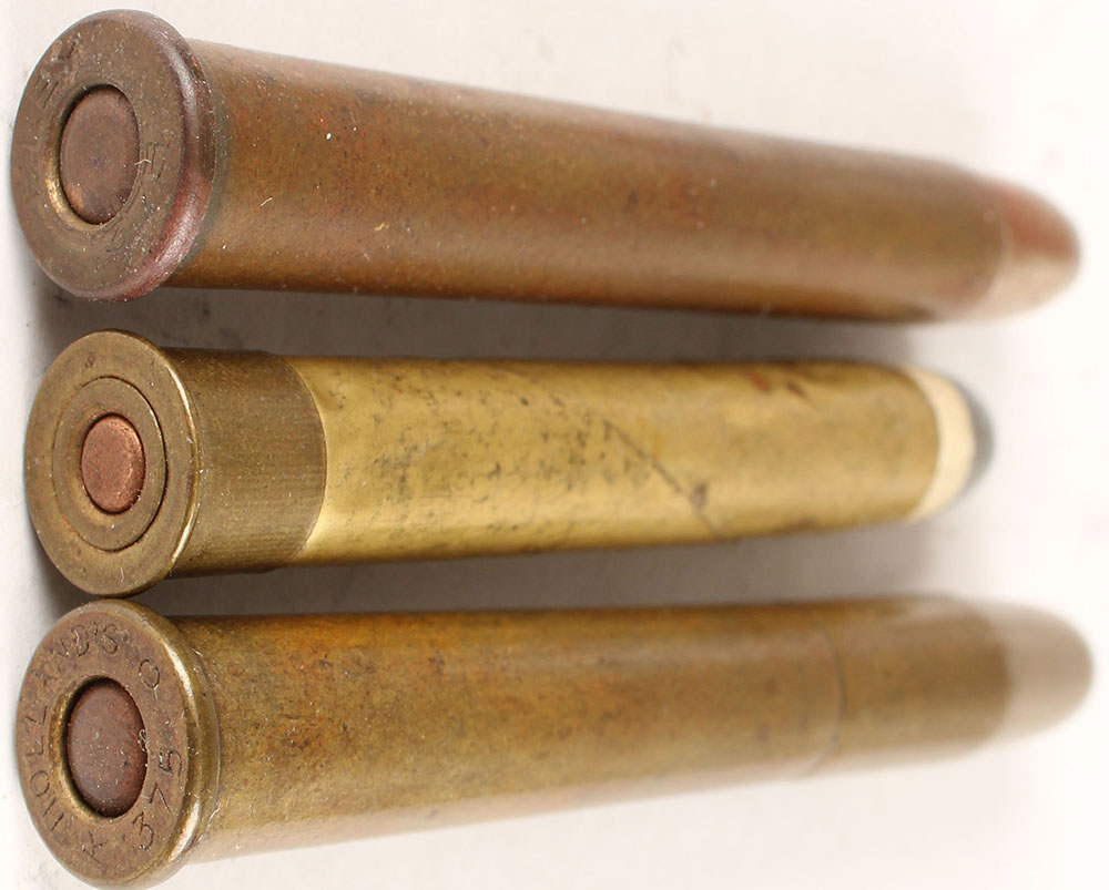 Lot of 3. (2) 375 x 2.5'' Flanged. 1--HS:''ELEY .375'', RN CN SP. 1--HS:''HOLLAND'S C .375 K'', FN CN Hollowpoint. (1) 360 X 2.25'' Express. NHS. Coil Case, boxer primed. RN PP Lead with copper tube. Grade: Very Good ++ - Value: 10 to 30