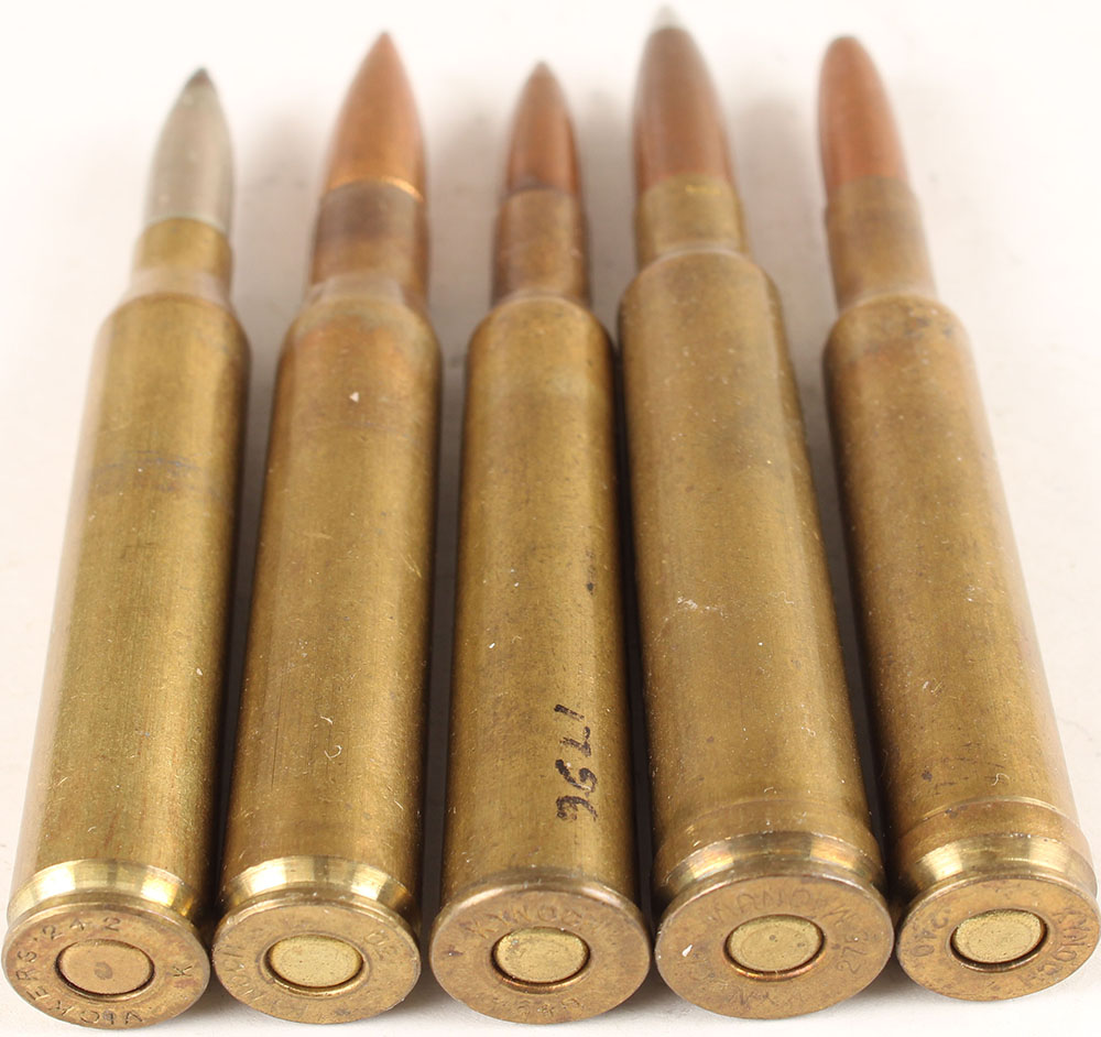 Lot of 5 British Sporting Cartridges, One each of the following: 242 Vickers--HS:''VICKERS .242 K'', PT CN w/ Copper Tip. 240 rimless--HS:''KYNOCH .240'', PT CJ SP. 240 Flanged--HS:''KYNOCH .240'', PT CJ Powerpoint. 30-06 Sprg--HS:''KYNOCH .30'', PT CJ Powerpoint. 275 H&H Magnum--HS:''KYNOCH 275 MAGNUM'', PT CJ silvertip. Grade: Excellent - Value: 20 to 50