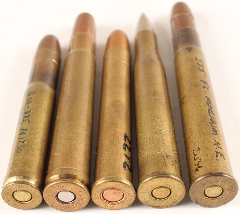 Lot of 5. Mixed lot of British medium caliber ammunition. One each of: Holland's 300 rimmed, 375 H&H, 375H&H Flanged, , 375 x 2.5'' flanged, Holland's 400/375 Belted Nitro Express. Grade: Excellent - Value: 10 to 30