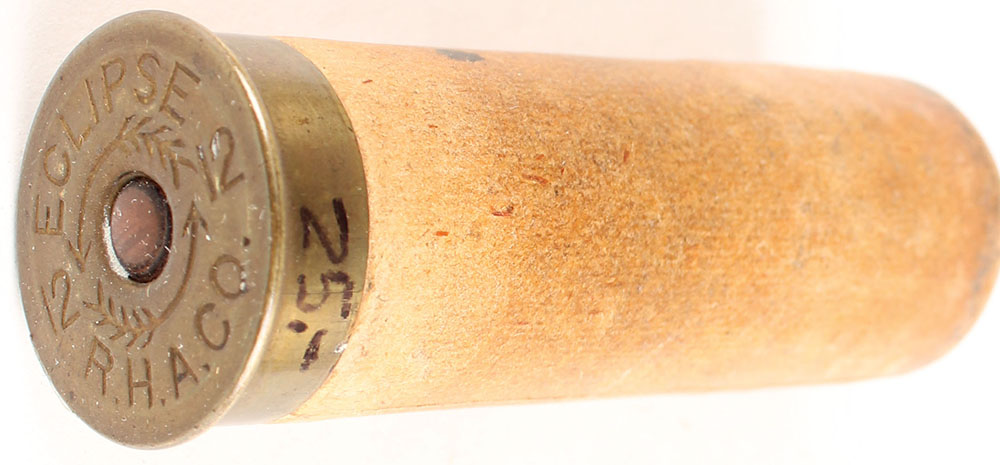 H/S= ''Eclipse 12ga R.H.A.CO.'' 2 3/8'' OAL, loaded tan paper case. Grade: Very Good + - Value: 10 to 50