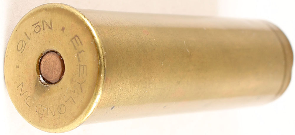 H/S= ''ELEY LONDON No 16'' 2 1/2'' OAL, empty brass shotshell. Grade: Very Good ++ - Value: 6 to 30