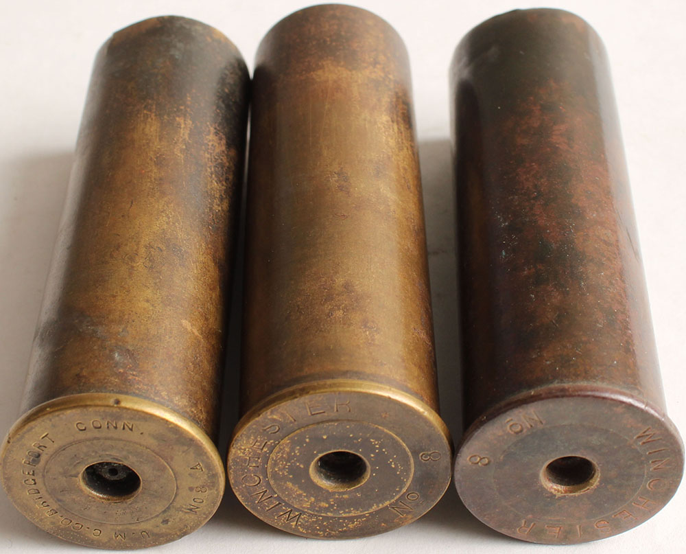 Lot of 3 mixed H/S, 8 gauges, empty brass shotshells. Grade: Very Good - Value: 10 to 80