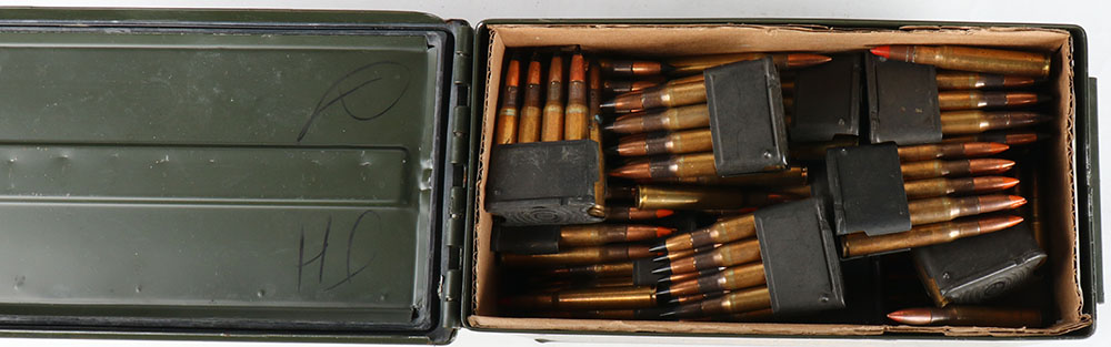 M2A1 .50 cal ammo can filled with 372 Rds. Of surplus 30-06, is a mix of standard Ball, Black tip AP, & orange tip tracers, most of the ammo is in 8 Rd. M1 Garand Enbloc clips, 8 Rds. are loose, ammo is very good, a few rounds have light corrosion. Grade: Very Good ++ - Value: 200 to 400