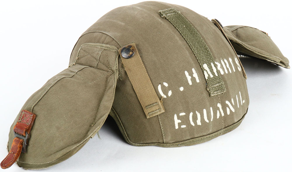US, M4A2 WW2 USAAF bomber crew Flak Helmet, Industrial Canvas Prod. Corp produced, missing leather chin strap, back of helmet is marked in white paint ''C.HARRIS'', ''EQUANIL''. Light scuffs/wear, bottom edges of ears has holes worn in. Grade: Very Good ++ - Value: 100 to 200