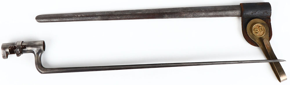 US, M1873 socket bayonet for the trapdoor Springfield, bluing is spotty with areas of thinning, blade is marked ''US'', ''S'', comes with sheath & frog, bag of brass bar is marked ''RIA''. Grade: Excellent + - Value: 80 to 160