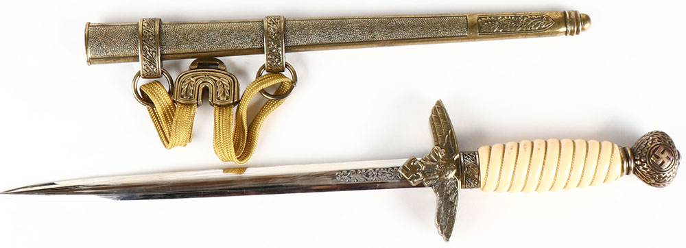German, WW2 Luftwaffe officer parade dagger, no makers marking on the blade, comes with sheath & rope attachment point, dagger is likely a reproduction based on no makers mark on blade. Grade: Very Good ++ - Value: 50 to 100