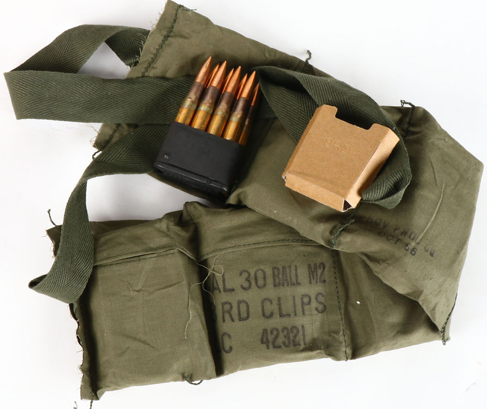 US, Lake City, 6 pouch Bandoleer, each pouch has one 8 Rd Enbloc clip of 30-06 M2 Ball, 48 Rds. total, Bandoleer is marked ''CAL 30 BALL M2'', ''8RD CLIPS'', ''LC 42321'', back of bandoleer is dated OCT of 1966, ammo is dated 1967, ammo is excellent. Grade: Excellent - Value: 50 to 100