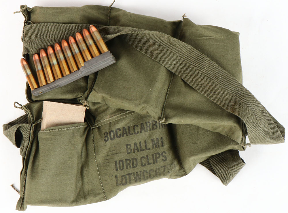 US, Western, 6 Pouch Bandoleer, each pouch has two 10 Rd. clips of .30 carbine, 120 total Rds., bandoleer is marked, ''30CARBINE'', ''BALL M1'', ''10RD CLIPS'', ''LOTWCC6799'', ammo is dated 1953, ammo Is Excellent. Grade: Excellent ++ - Value: 80 to 160