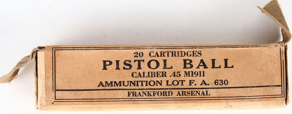 Frankford Arsenal, Cal. .45 M1911 Ball, Lot F.A. 630, 1pc, FULL & SEALED, buff box & label with black print, box is solid with minor rub wear & a few small spots of stains. Grade: Excellent - Value: 20 to 40