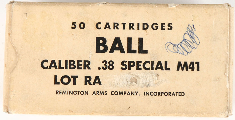 Remington, .38 Special M41 Ball, 1pc, Full, white box with black print, box is solid with light age soiling, tears on front of box, pen marks, light rub marks, & light edge wear, ammo is excellent. Grade: Very Good - Value: 30 to 60