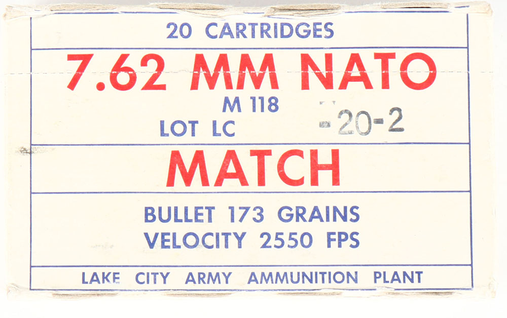 Lake City, 7.62mm Nato Match, M 118, Lot LC 20-2, 1970 date, 1pc, FULL & SEALED, white box with red/blue print, box is solid with light rub marks. Grade: Excellent + - Value: 20 to 40