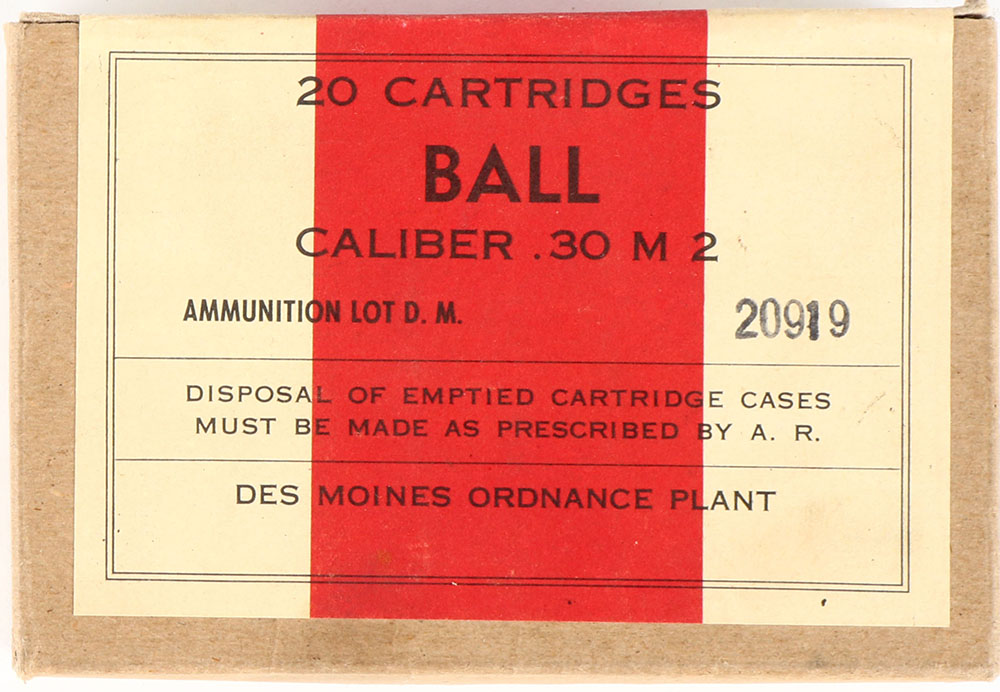 DES Moines, .30 M2 Ball, Ammo Lot D.M. 20919, 1pc, FULL & SEALED, buff box with buff/red label & black print, box is solid with light age soiling. Grade: Excellent ++ - Value: 20 to 40