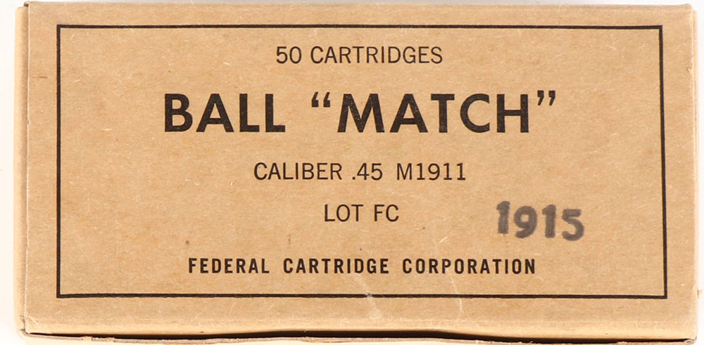Federal, .45 M1911 Ball Match, Lot FC 1915, 1pc, Full, brown box with black print, box is solid with little to no wear, ammo is MINT. Grade: MINT - Value: 30 to 60