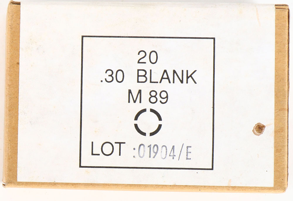 US, .30 M89 Blank, 30-06, Lot 01904/E, 1pc, Full, buff box with white label & black print, box is solid with light age soiling, ammo is excellent. Grade: Excellent - Value: 10 to 30
