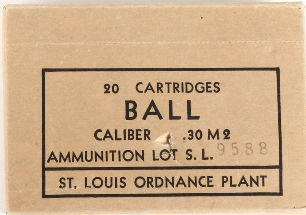 ST. Louis, .30 M2 Ball, Ammo Lot S.L. 9588, 1pc, FULL & SEALED, buff box with black print, box has a puncture. Grade: Excellent - Value: 20 to 40