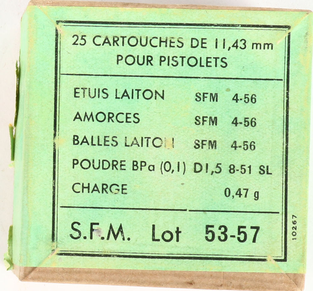 Societe Francaise des Munitions, French, 11,43mm (45 ACP), S.F.M. Lot 53-57, 2pc, Full, buff box with green label & black print, box is solid with small tears in label, pen marks, rub marks & light edge wear, ammo is excellent. Grade: Excellent - Value: 10 to 30