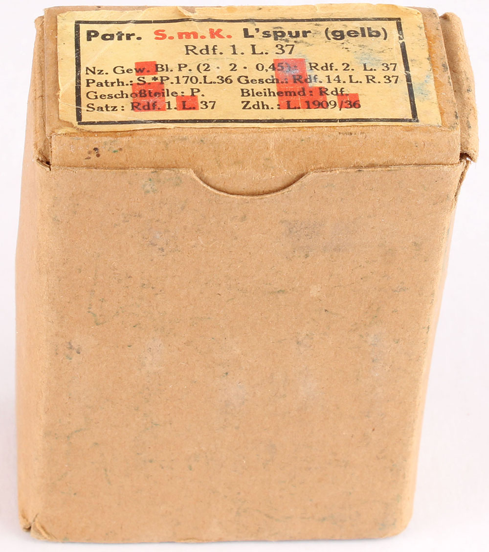 German, 7.92x57mm s.m.k. L'spur (gelb), Tracer armor piercing ammo, dated 1936, 1pc, Full, brown box with yellow label & black/red print, box is solid with handling wear, & rub marks, ammo is very good. Grade: Excellent - Value: 30 to 90