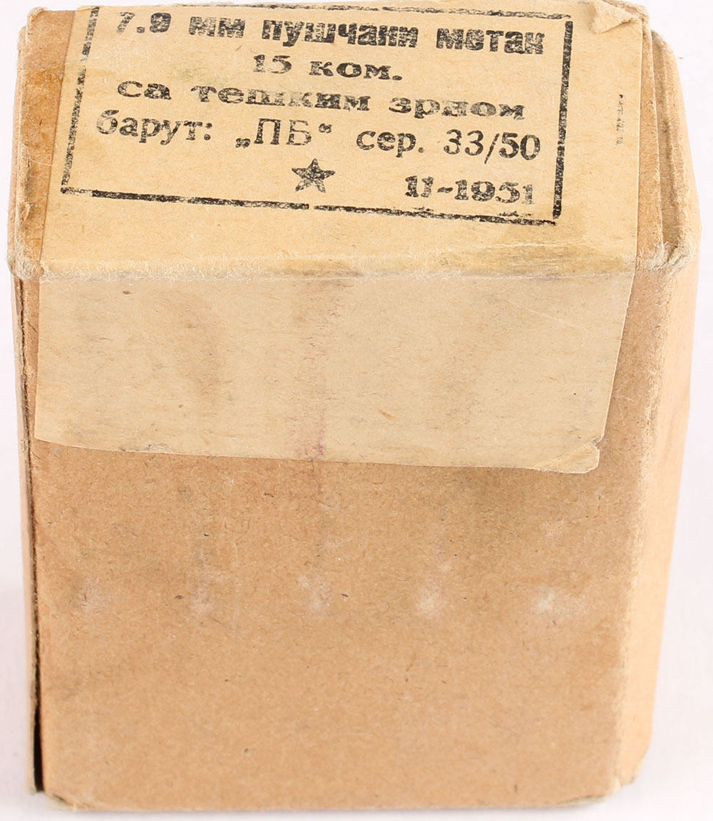 Yugo, 7.92x57mm, dated 1951, 1pc, Full, buff box & label with black print, box is solid with light stains & rub wear, ammo is very good but is corrosive. Grade: Very Good ++ - Value: 10 to 30