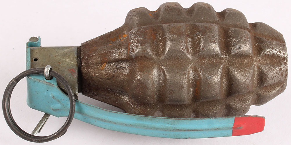 US, WW2 MK2 ''Pineapple'' practice grenade, milled out shell with blue colored spoon. Grade: Very Good ++ - Value: 80 to 160
