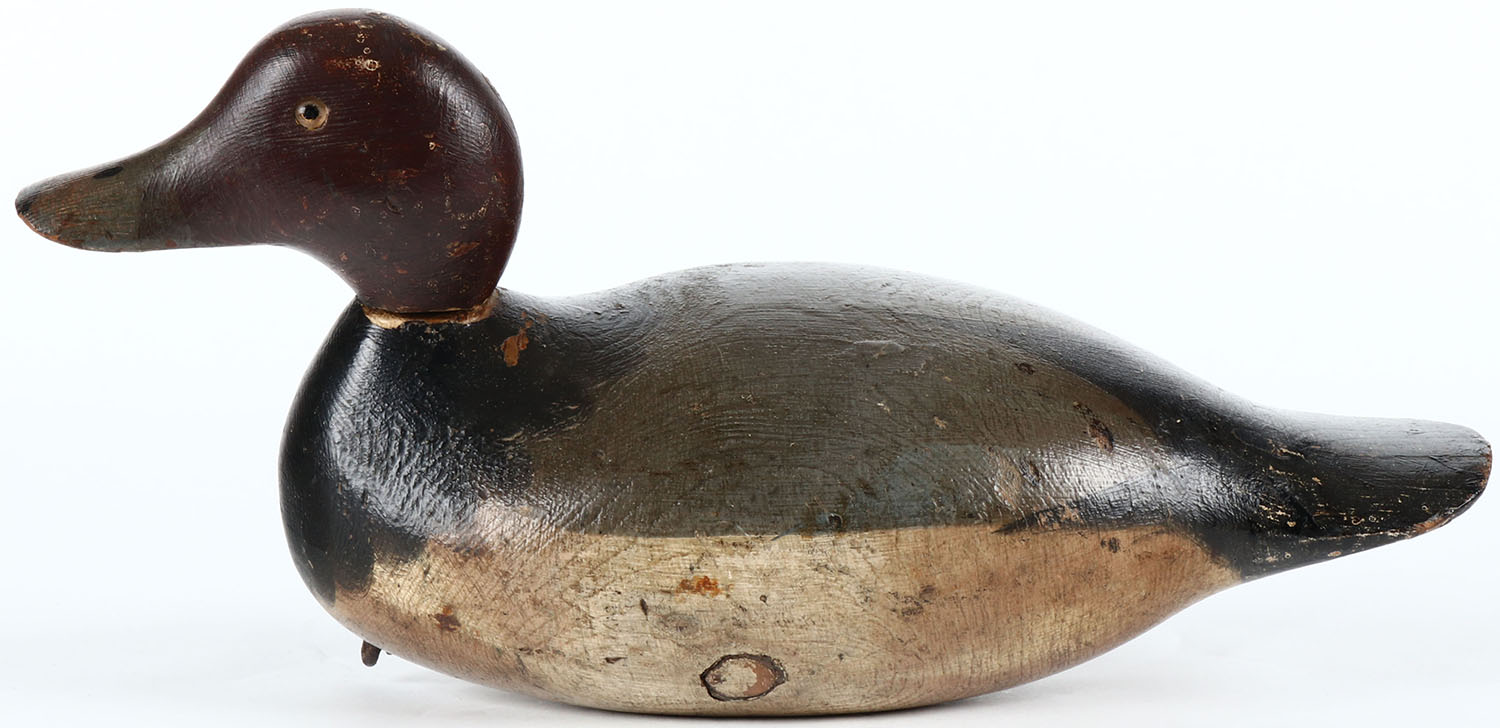 Late Standard Redhead Drake by Mason Decoy Company, Detroit, MI, 1896-1924. Glass eyes, solid wood, strong original paint with an original Mason weight, has age crack on bottom. Grade: Very Good - Value: 60 to 120