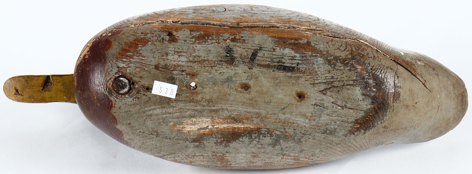Challenge Mallard Drake by Mason Decoy Company, Detroit, MI, 1896-1924. Glass eyes, solid wood, vibrant original paint with wear, has age cracks on back and bottom of body, head moves from side to side. Grade: Very Good + - Value: 100 to 200