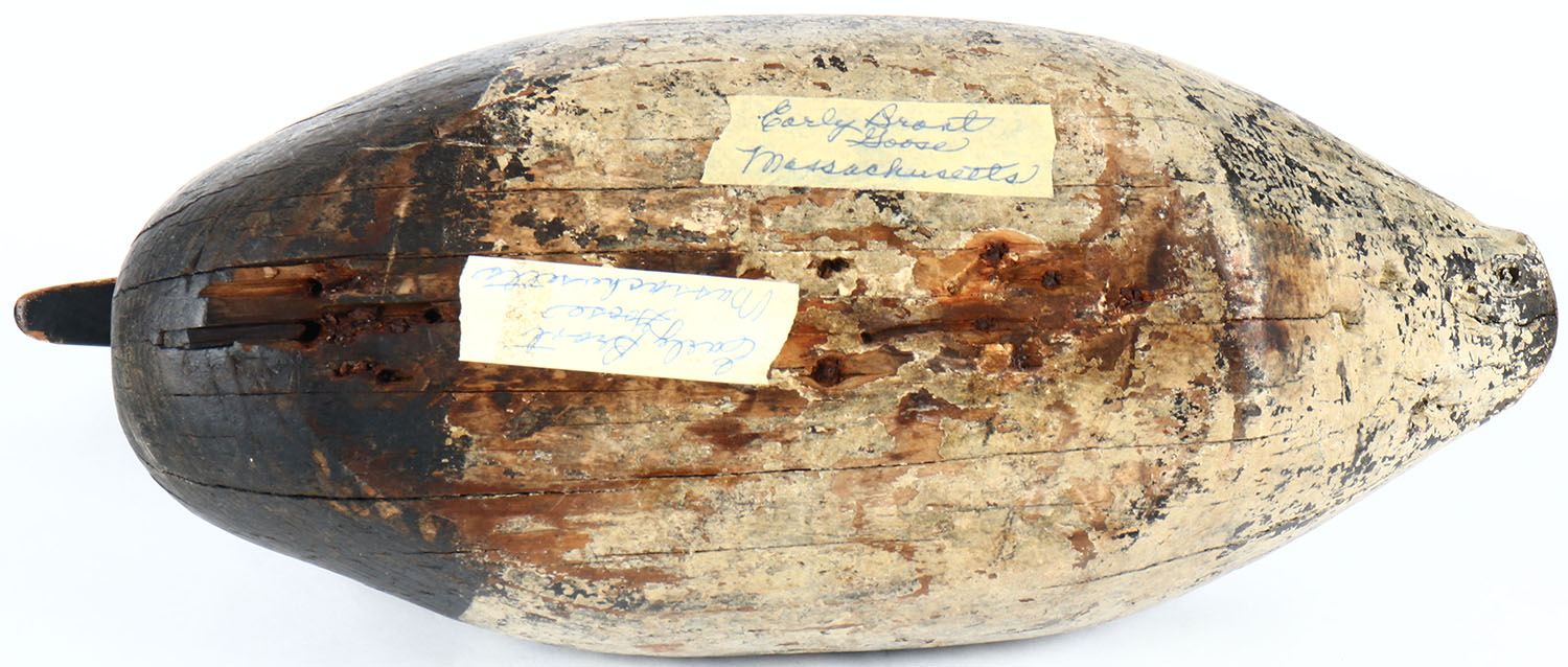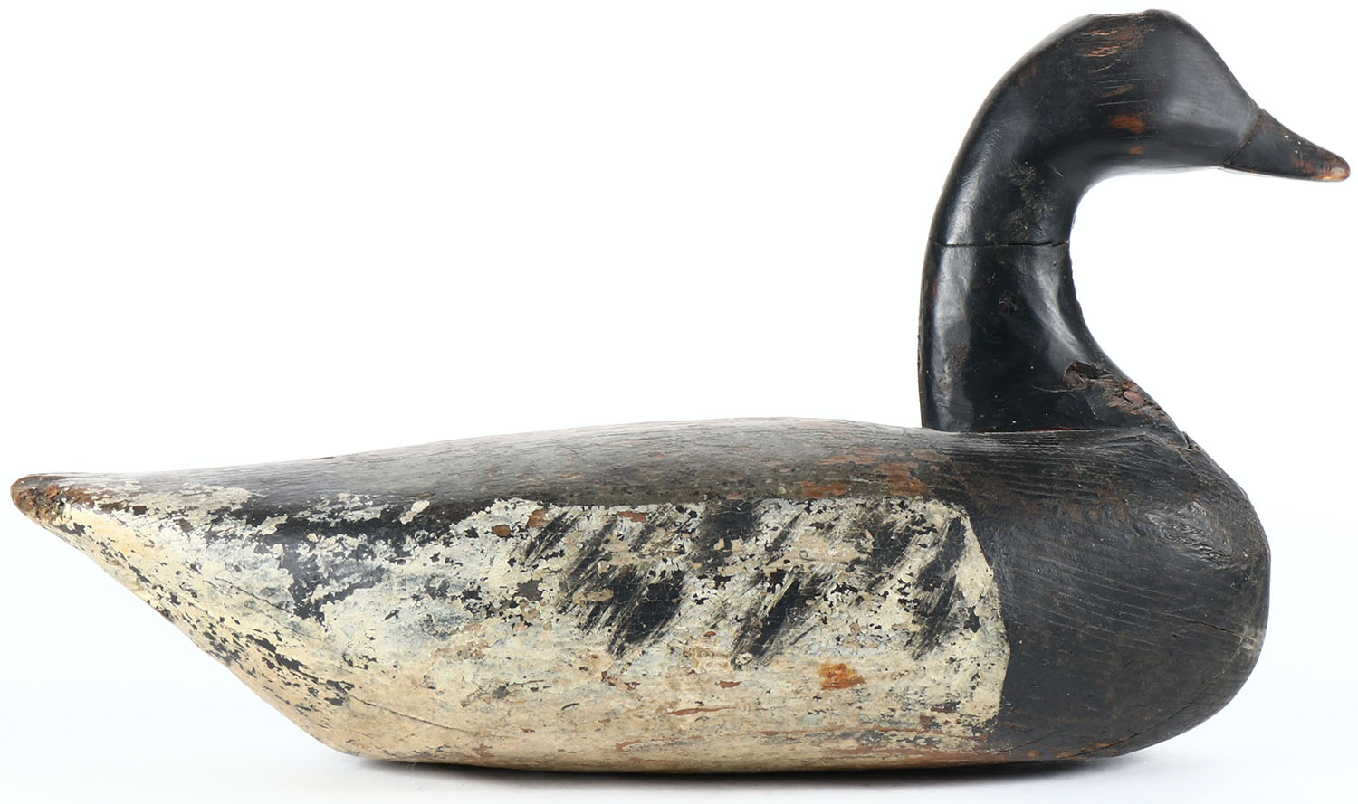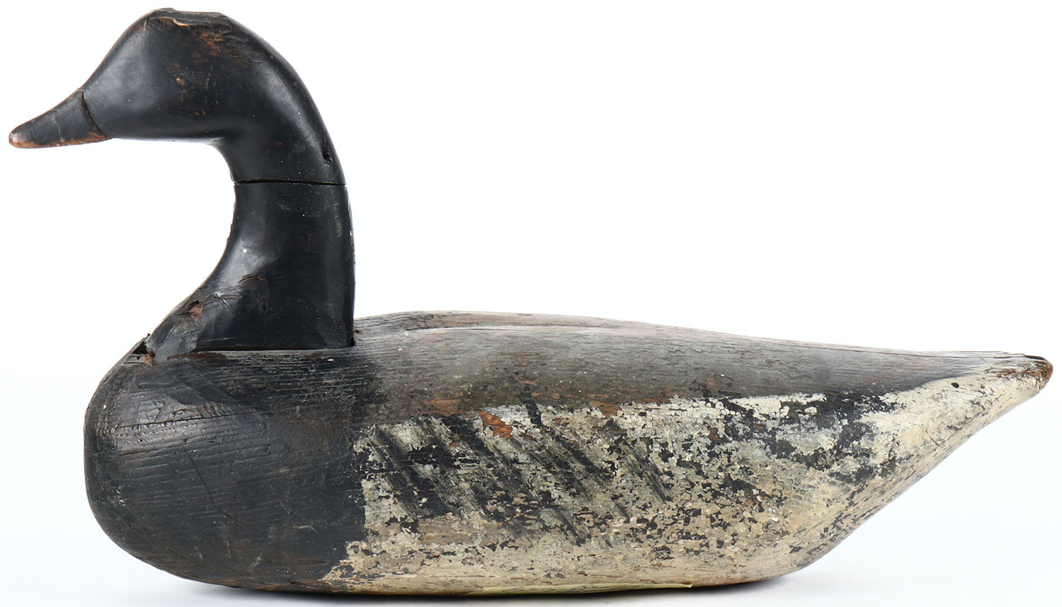 Black Brant by unknown maker. Painted eyes, solid wood, shows mostly old hunter repaint on this old decoy with age cracks on bottom and on top of tail. Grade: Very Good - Value: 80 to 160