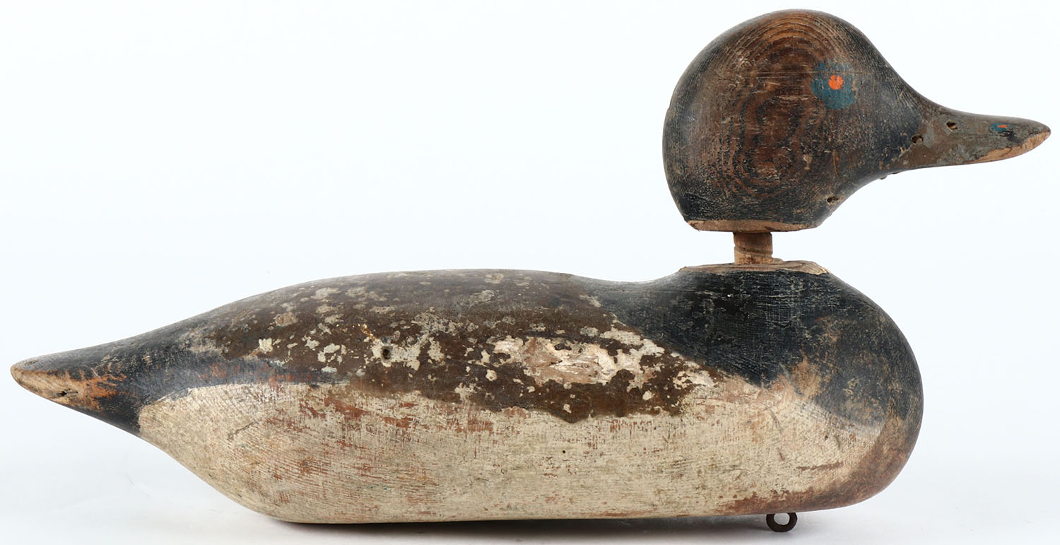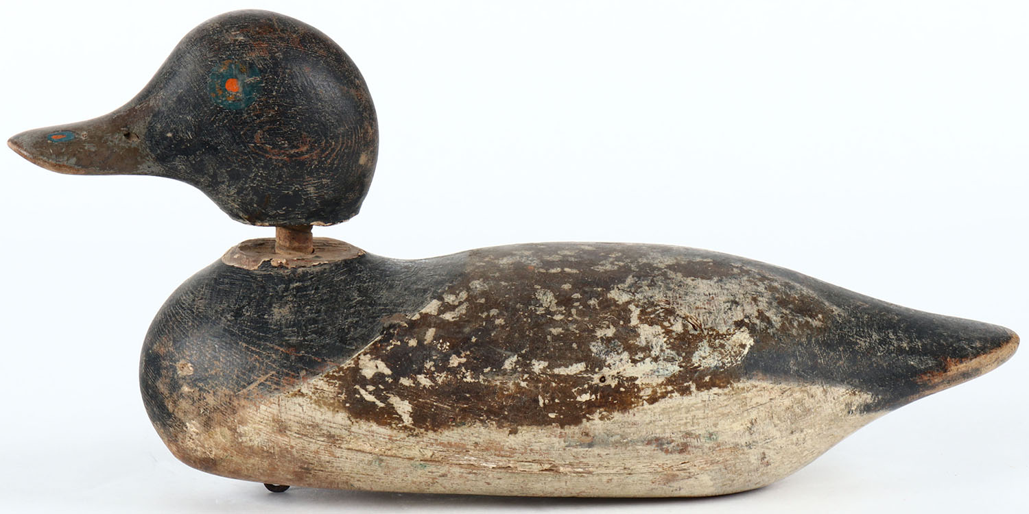 Painted-Eye Bluebill Drake Mason Decoy Company, Detroit, MI, 1896-1924. Solid wood, combination of hunter strengthening and some original paint showing with typical wear, head comes all the way off. Grade: Very Good - Value: 40 to 80