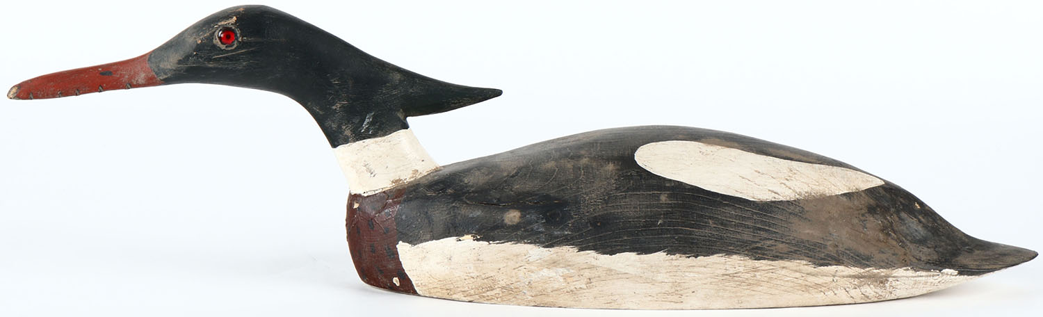 Swimming Hooded Merganser by unknown maker, glass eyes, solid wood, original paint, structurally excellent. Grade: Excellent - Value: 26 to 50