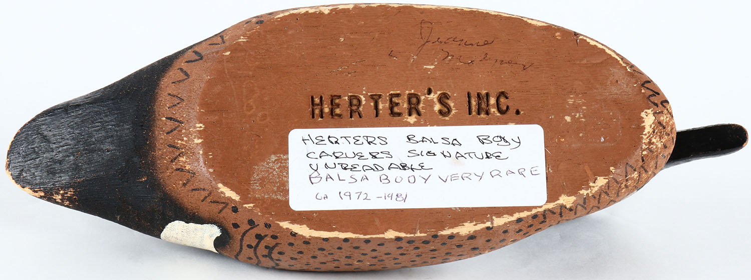 Blue Wing Teal Drake by Herter's Inc. glass eyes, solid balsa wood, original paint with typical wear, structurally excellent, branded by HERTERS INC. on bottom. Grade: Excellent - Value: 30 to 100