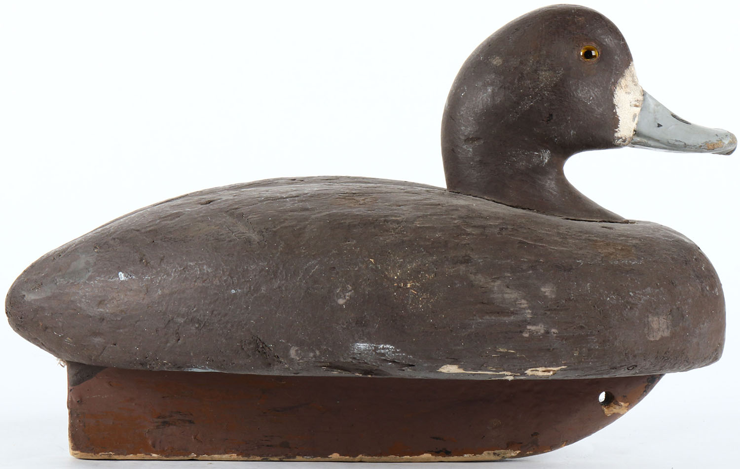 Bluebill Hen by unknown maker, glass eyes, solid balsa wood, old hunter repaint, structurally excellent. Grade: Very Good - Value: 40 to 80