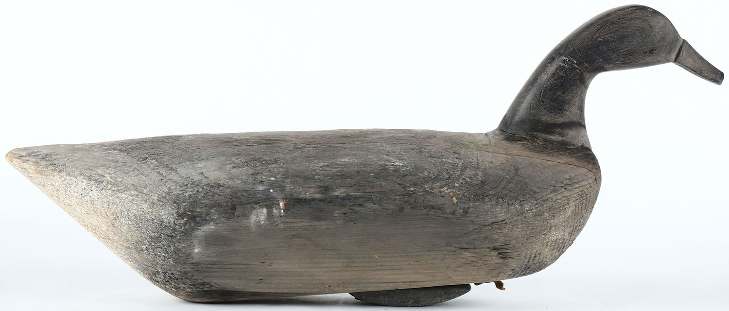 Black Brant by unknown maker, no eyes, solid wood, original paint, has age cracks on back. Grade: Very Good + - Value: 200 to 400