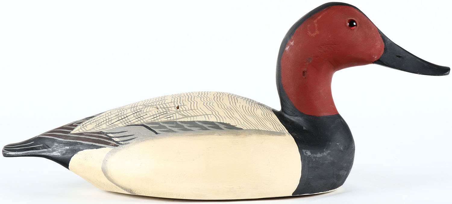 Canvasback Drake by George Bell, Crisfield, MD. Glass eyes, solid wood, original paint, structurally excellent, signed on bottom. Grade: Excellent - Value: 70 to 150