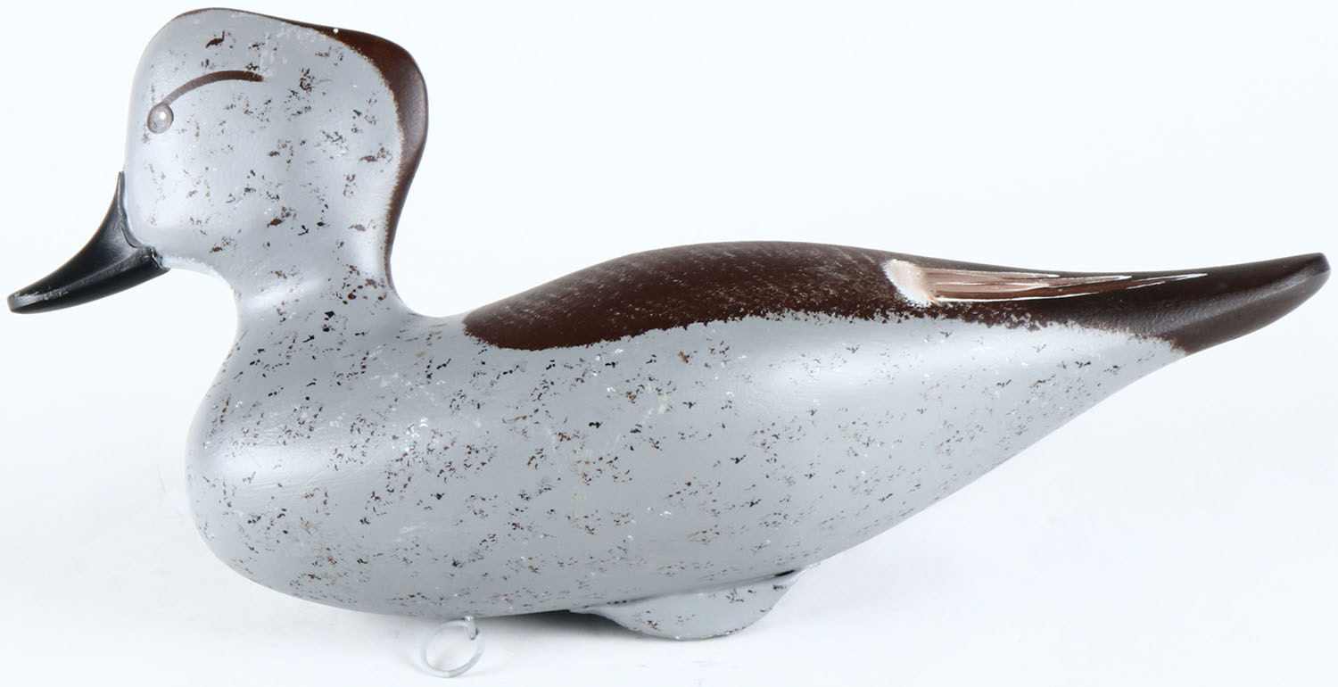 Oldsquaw Hen by ''Spencer'', painted eyes, solid wood, original paint, structurally excellent, branded SPENCER on bottom. Grade: Excellent - Value: 50 to 100