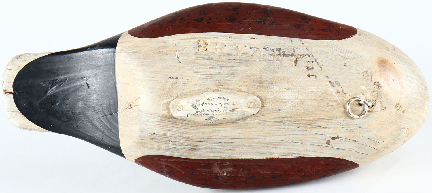 Preening Shoveler Drake by Capt. Bryant, Perryville, MD, painted eyes, solid wood, original paint, structurally excellent, branded BRYANT on bottom. Grade: Excellent - Value: 50 to 100
