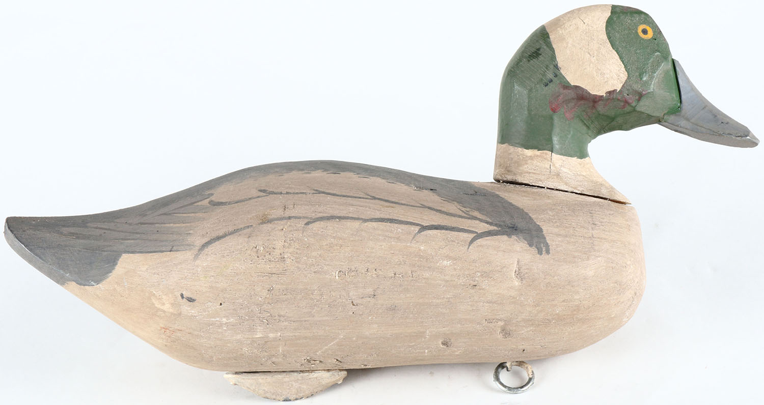 Bufflehead Drake by HRJ, painted eyes, solid wood, repainted ?, has age crack on bottom, branded HRJ on bottom. Grade: Excellent + - Value: 50 to 100