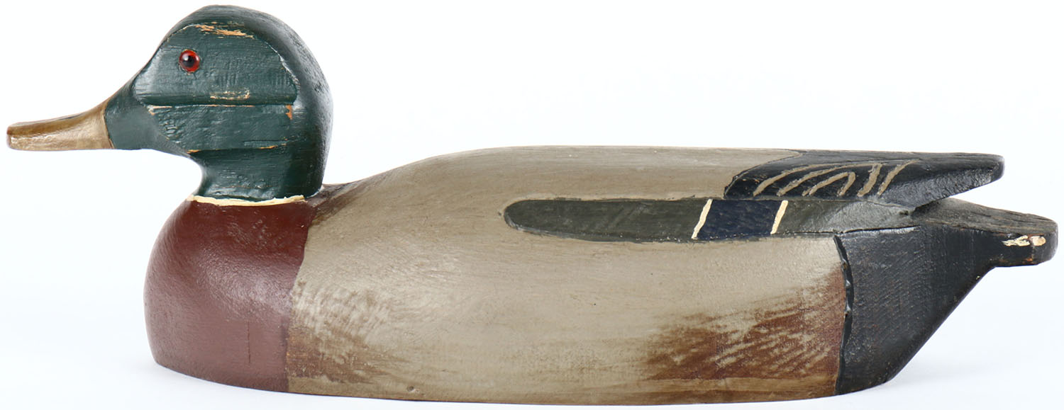 Mallard Drake by unknown maker, glass eyes, solid wood, original paint, has chip in head. Grade: Very Good + - Value: 50 to 100