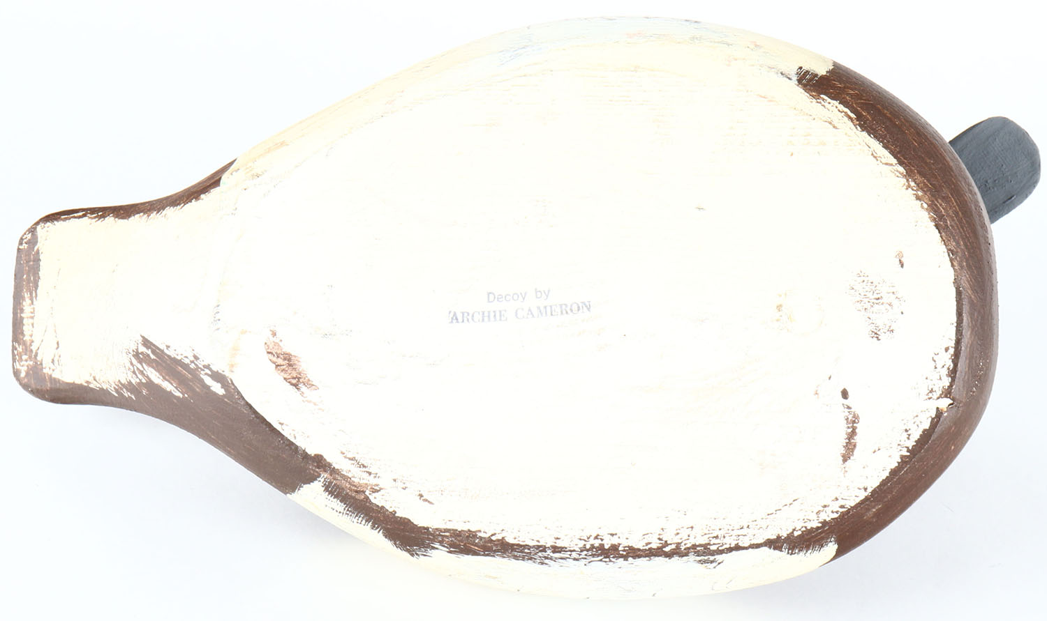 Bluebill Hen by Archie Cameron, Kingston, Ontario, Canada, glass eyes, solid wood, original paint, structurally excellent, stamped by maker on bottom. Grade: Excellent - Value: 40 to 80