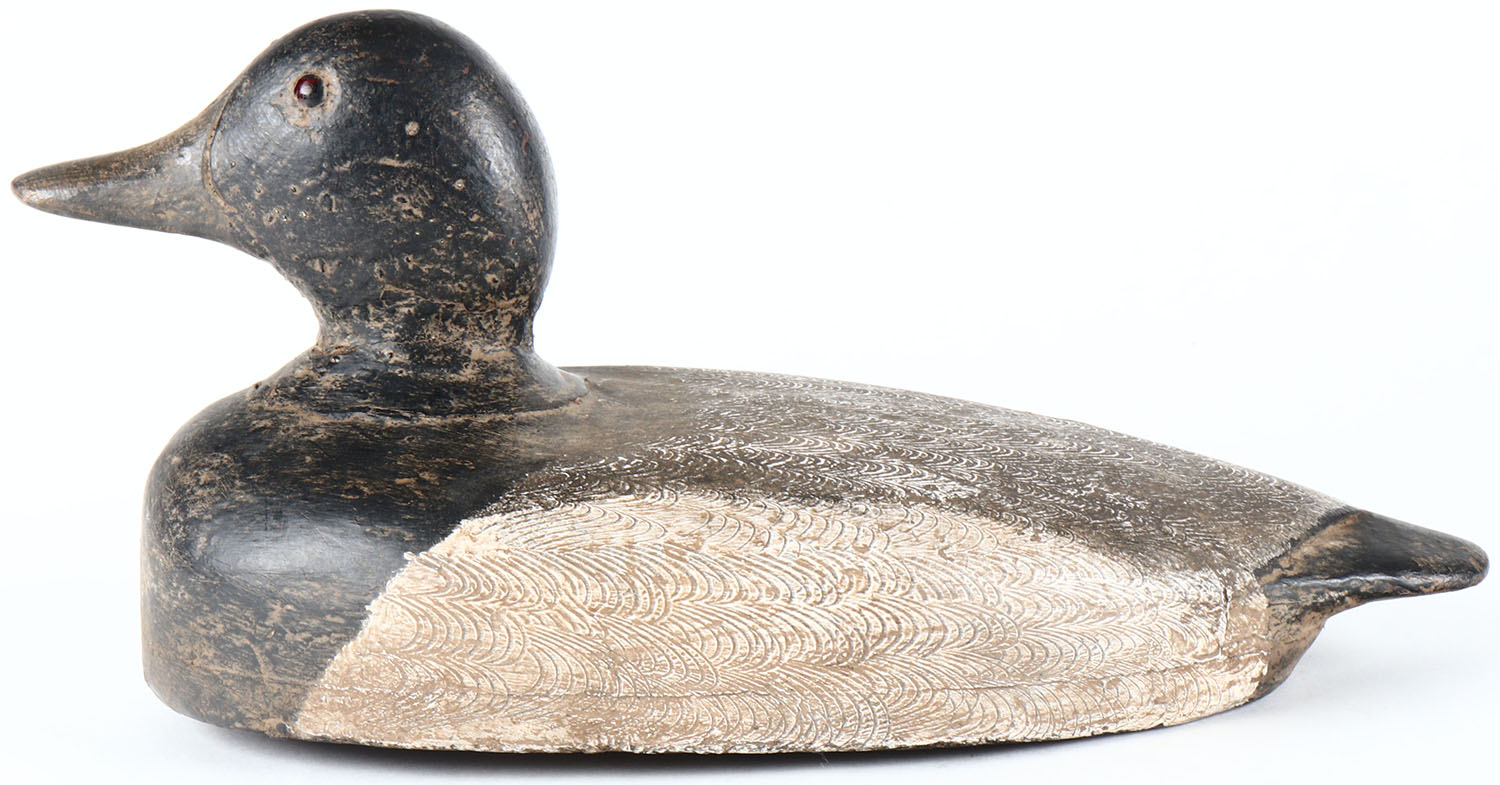 Bluebill Drake by unknown maker, glass eyes, hollow wood, original paint with comb painting, structurally excellent. Grade: Very Good + - Value: 40 to 80