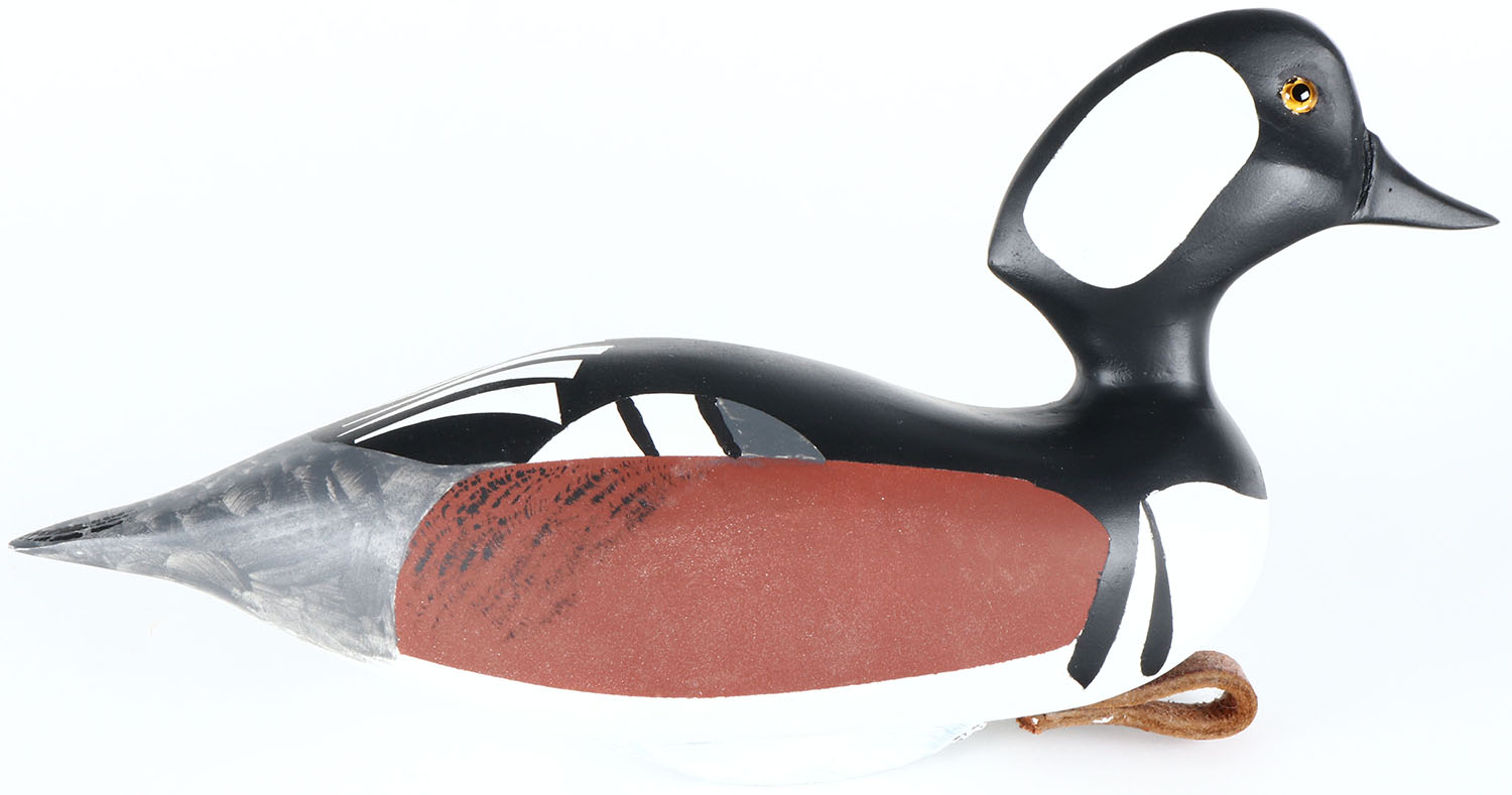Hooded Merganser by unknown maker, glass eyes, solid wood, original paint, structurally excellent. Grade: MINT - Value: 30 to 60