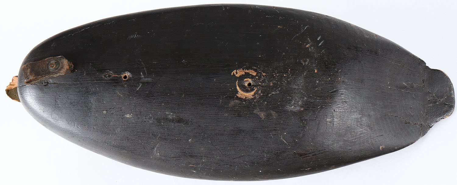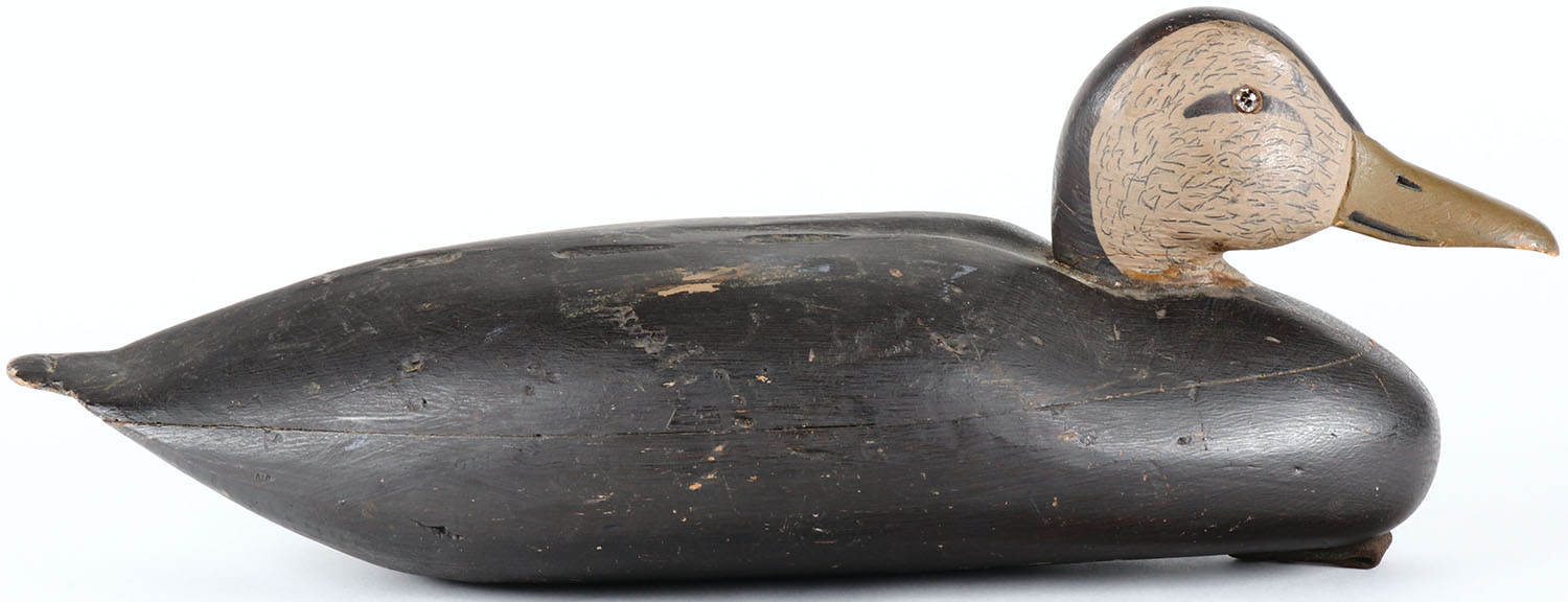 Black Duck by unknown Connecticut maker, glass eyes, hollow wood, a combination of original paint and hunter repaint, bill tip is chipped. Grade: Very Good - Value: 40 to 80