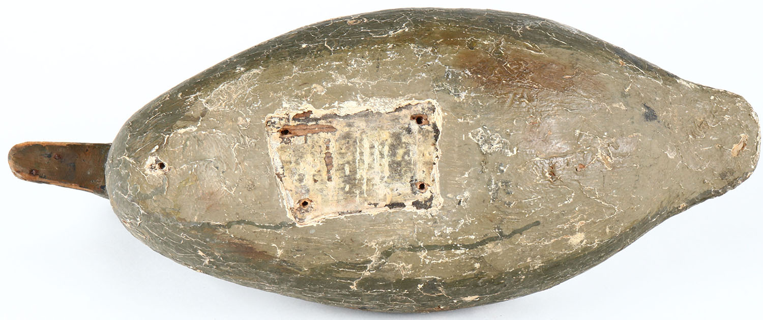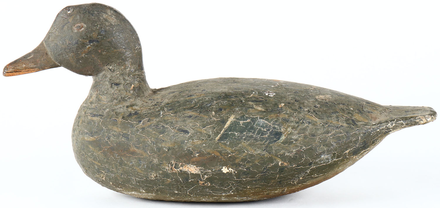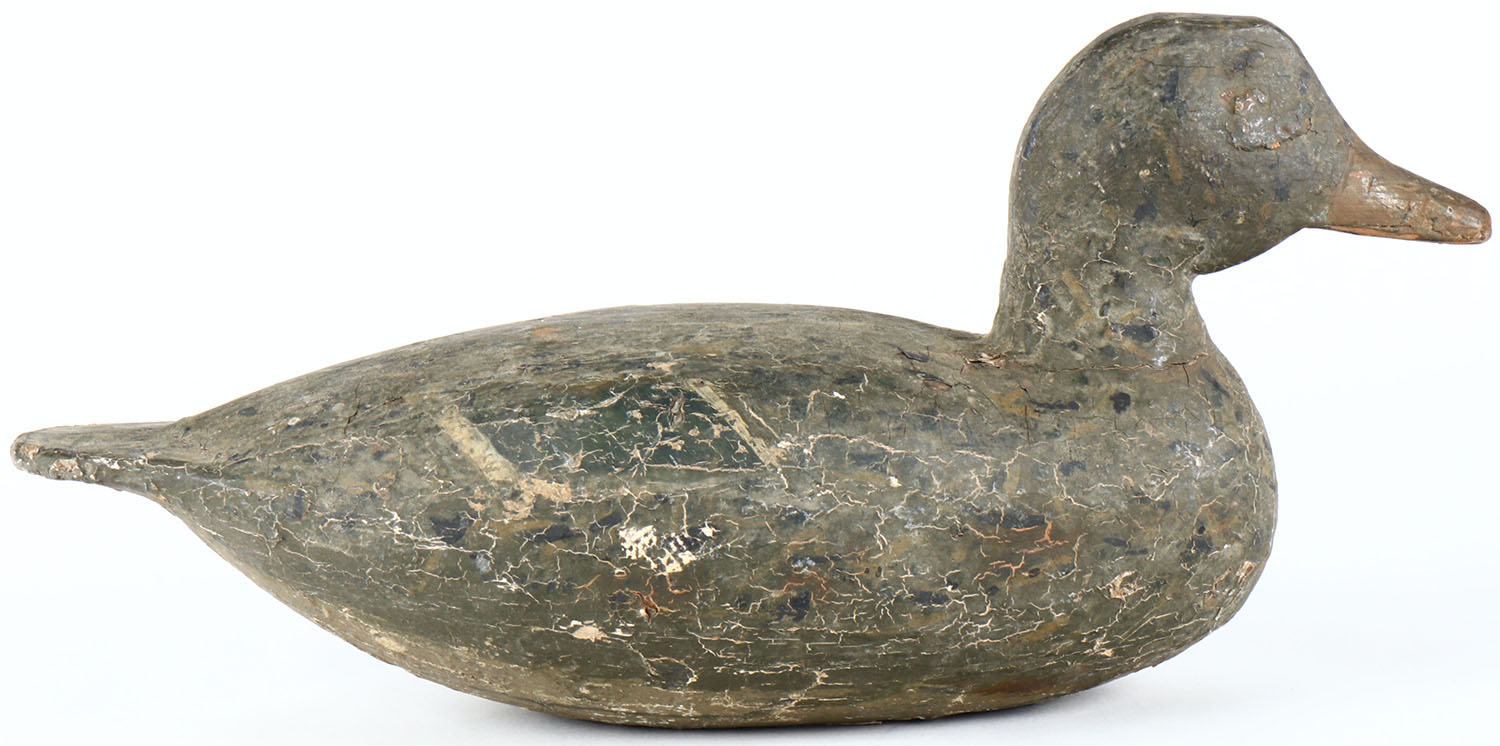 Hen Mallard by unknown maker, painted eyes, solid wood, old hunter working repaint, body has age cracks. Grade: Very Good - Value: 30 to 60